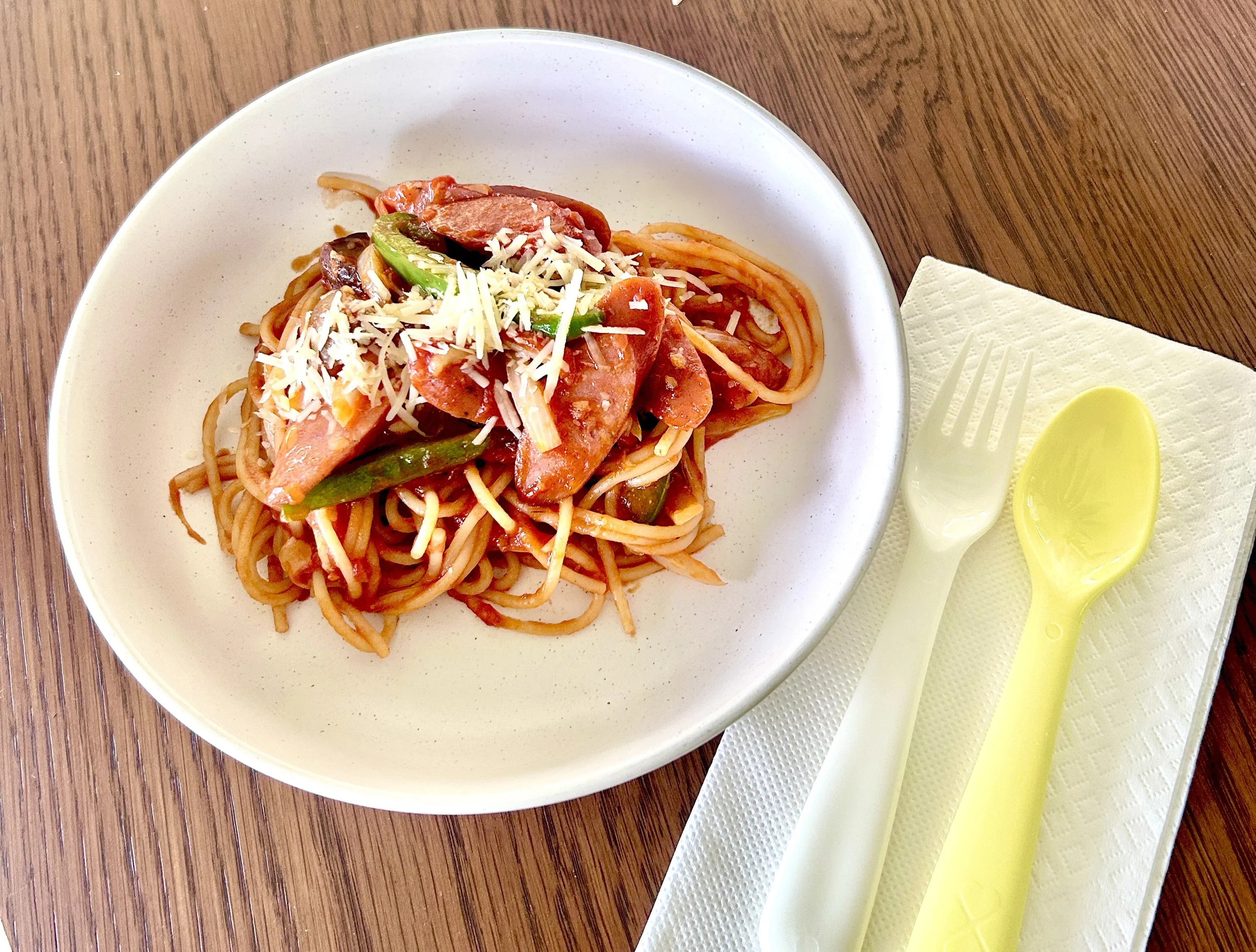 penne or spaghetti stir-fried with tomato-Sugo sauce, mushroom, onions, bell pepper and sausages 150